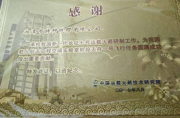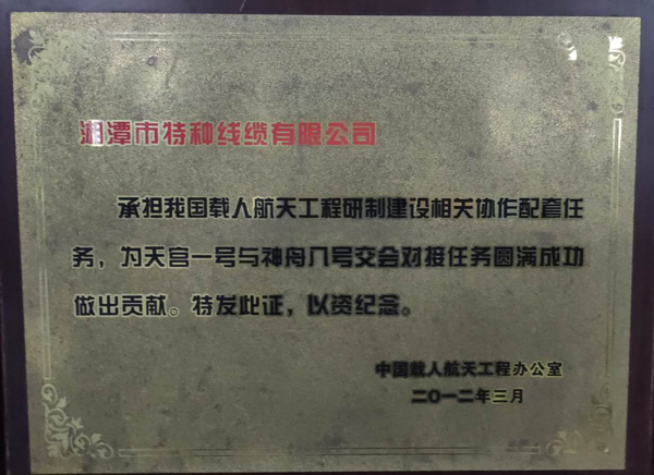 2011年9月29日,“神猴電纜”助力“天宮一號”,用長征二號F火箭將“天宮一號”目標器發(fā)射升空,同年,受到了中國載人航天工程辦公室的表彰